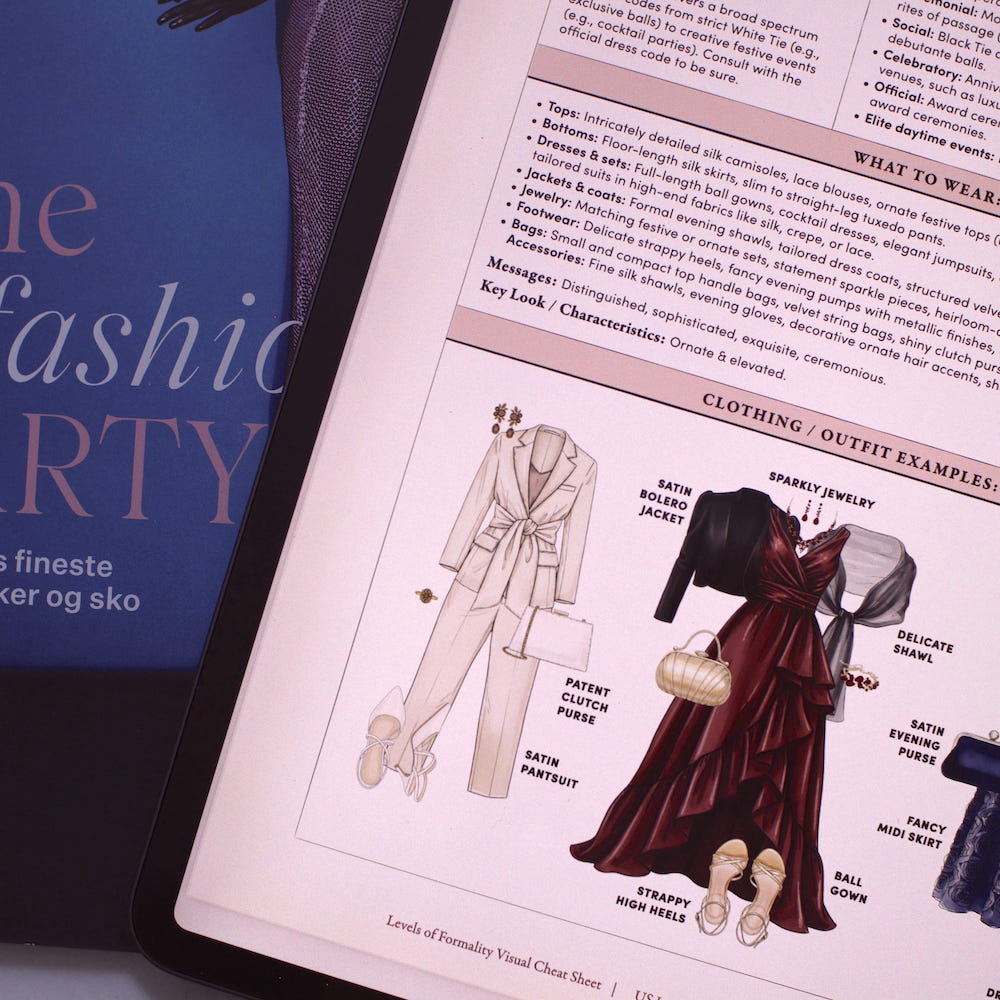 • THE VISUAL CHEAT SHEETS: 8 dedicated visual pages—one for each formality level (from Level 0 House/Rough Duties to Level 7 Formal Occasion). On every page, you will find: